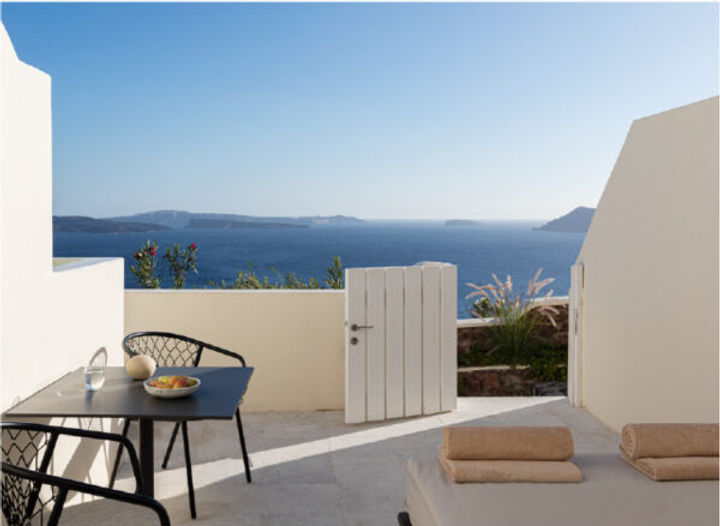 Part of Canaves Oia Luxury Resorts, Canaves Oia can be found outside town, above the quiet fishing village of Ammoudi. Here, you’ll discover 49 vacation rentals — each a luxury villa with a private plunge or swimming pool. Consider this the quintessential honeymoon stay, replete with king-size beds, sprawling living rooms boasting sea views, and a simplistic decor that refuses to distract from the surrounding beauty. Of the many stand-out experiences the hotel can arrange for you, don’t skip on having a sunset wine-tasting. Other destinations in Europe might snag the title of wine capital, but Santorini happens to be the most famous wine region in all of Greece, with a wine-making history extending back 3,000 years.
